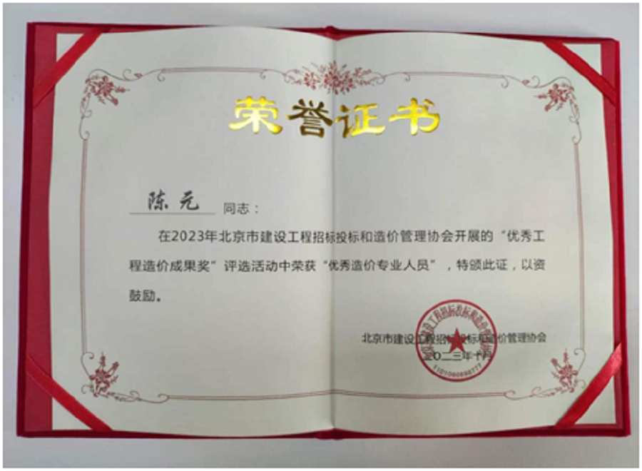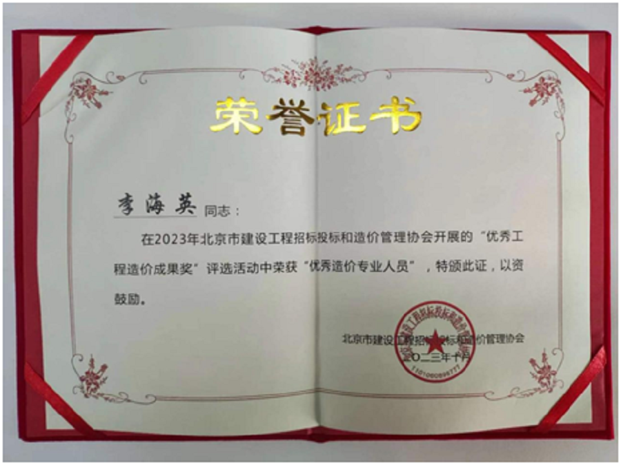 2023年10月在北京市建设工程招标投标和造价管理协会开展的2023年度优秀成果案例评选过程中,爱体育电竞网址荣获优秀工程造价成果奖,同时我司造价一部工程师李海英、陈元同志被评为“优秀造价专业人员”。