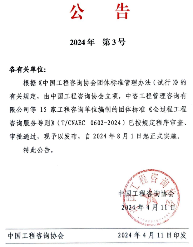 中国工程咨询协会《全过程工程咨询服务导则》(T/CNAEC 0602-2024)发布公告