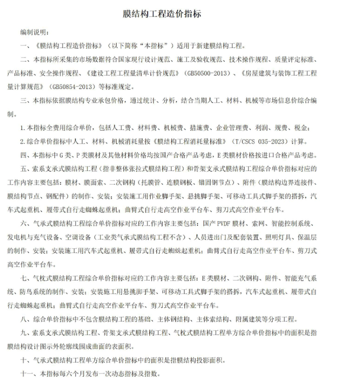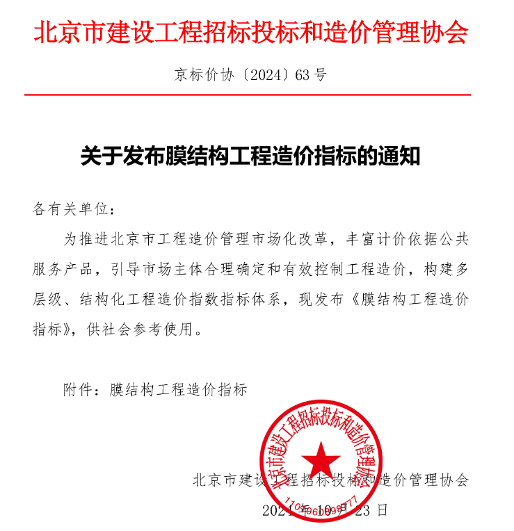 北京市建设工程招标投标和造价管理协会发布《关于发布膜结构工程造价指标的通知》