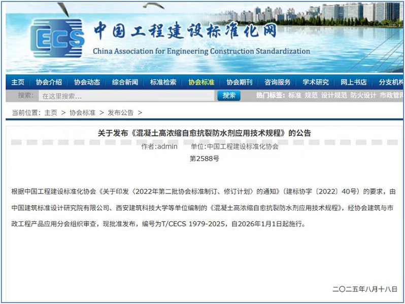 近日,经中国工程建设标准化协会批准,继我公司参编的《混凝土高浓缩自愈抗裂防水剂(T/CECS 10461-2025)》发布后,我公司参编的配套行业技术规程T/CECS 1979-2025《混凝土高浓缩自愈抗裂防水剂应用技术规程》也正式发布,并将于 2026年1月1日起实施。本规程对高浓缩自愈抗裂防水剂的材料、设计、施工、质量验收等进行了系统性规范。